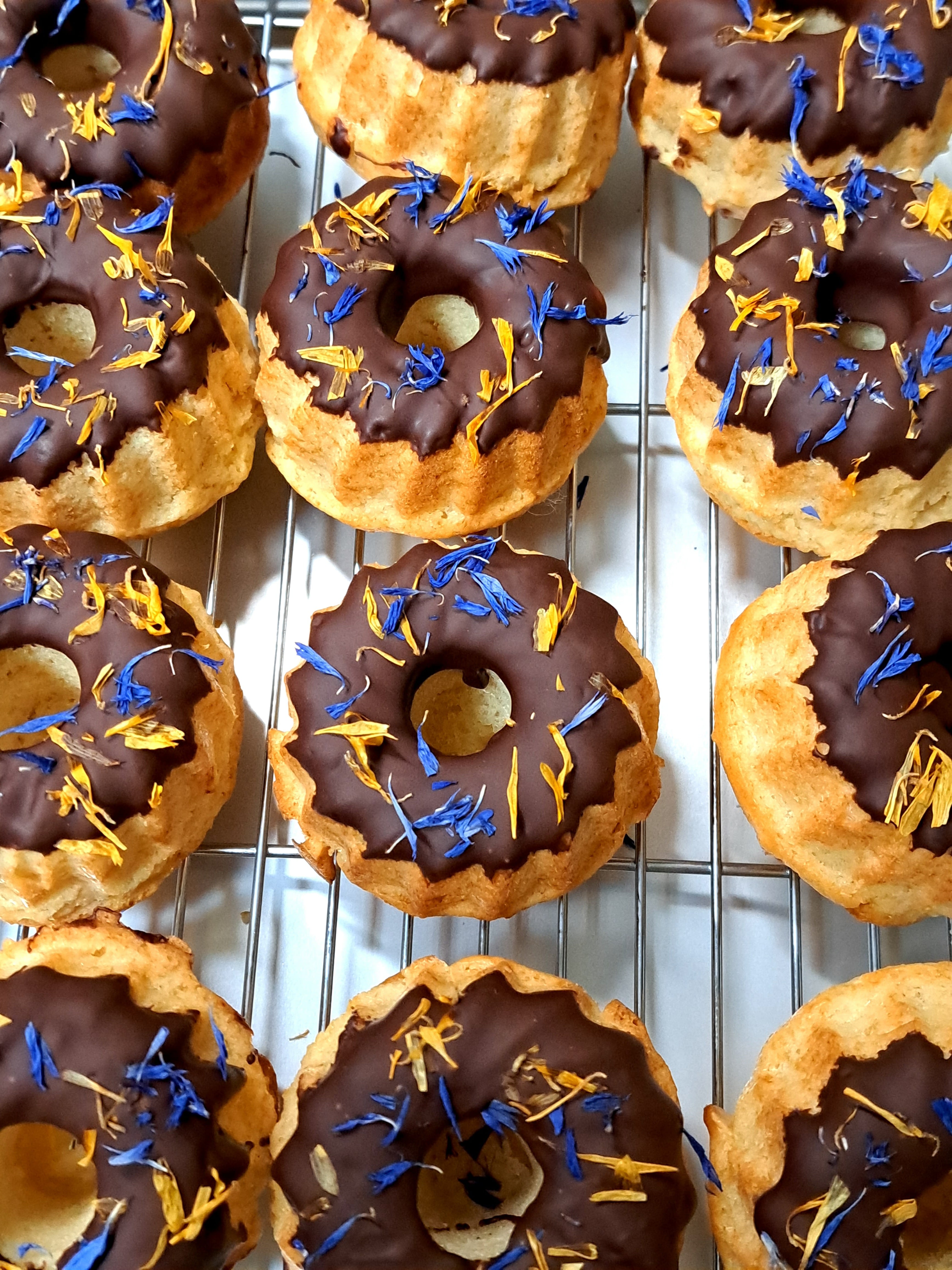 アーモンドスライスをたっぷり混ぜ込んだクグロフに上質なダークチョコをかけ、エディブルフラワー(キンセンカ、コーンフラワー)をトッピングしました。