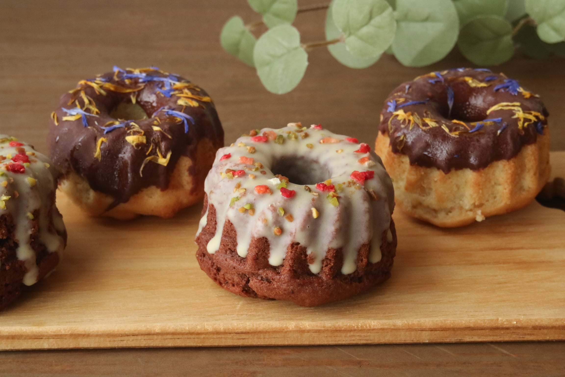 アーモンドスライスをたっぷり混ぜ込んだクグロフに上質なダークチョコをかけ、エディブルフラワー(キンセンカ、コーンフラワー)をトッピングしました。