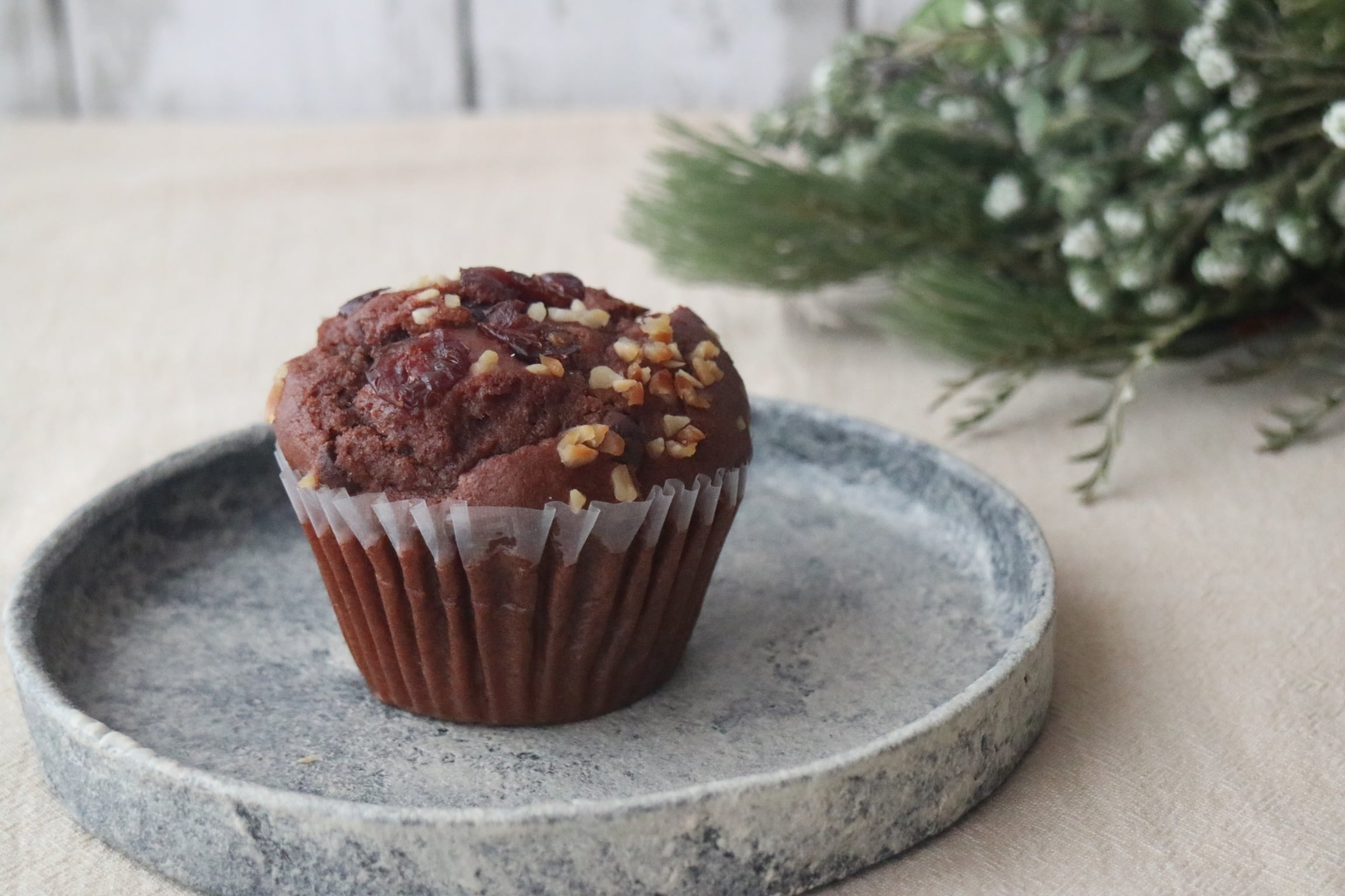 濃厚な有機ココアとビターな有機チョコチップを使用したマフィンに有機クランベリーを混ぜ込みました。