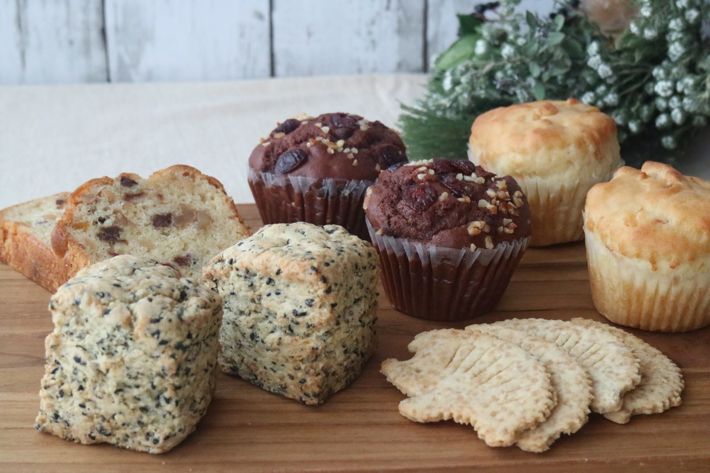 柑橘マフィン2個、有機クランベリーチョココアマフィン2個、有機黒ごまたっぷりスコーン2個、フルーツパウンドケーキ2カット、ハリネズミクッキー(1袋につき4枚入)×2袋